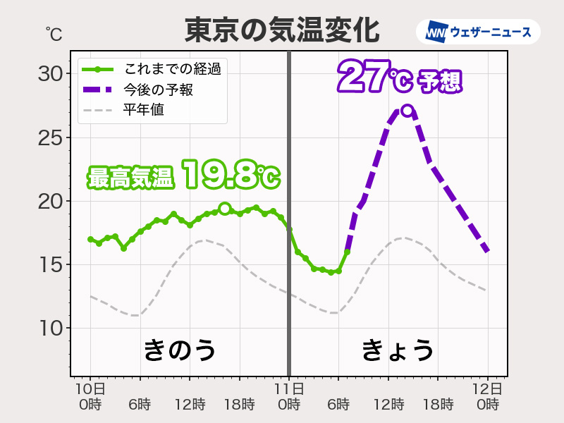 昨日より大幅に気温が上がるところが多く、東京都心では昨日より7℃高い27℃まで上がる予想です。