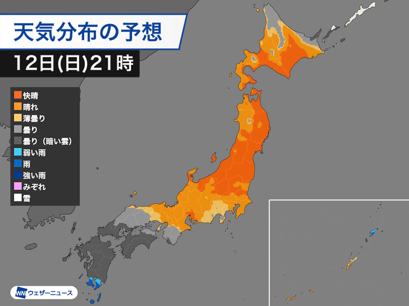 明日12日(日)は移動性高気圧が日本海に進み、東北から中国・四国にかけての広い範囲で穏やかな晴天となります。東北南部や北陸ではお花見も楽しめそうです。