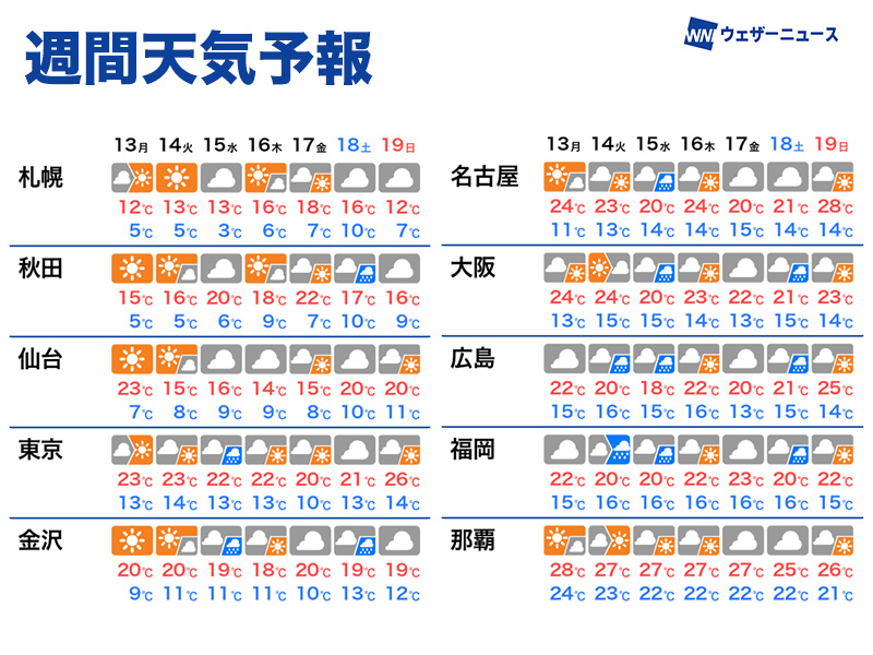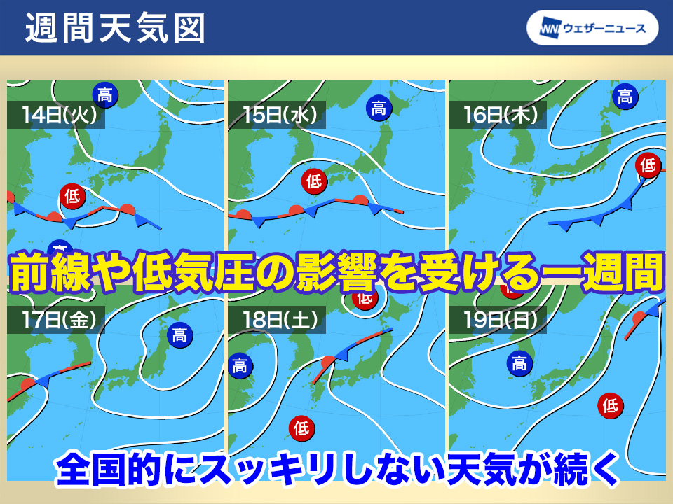 週の後半は予測の不確実性が大きいものの、スッキリしない天気が多くなりそうです。沖縄は湿った空気の影響で雲が広がりやすくなります。今週は各地で雨具が活躍する一週間となりそうです。