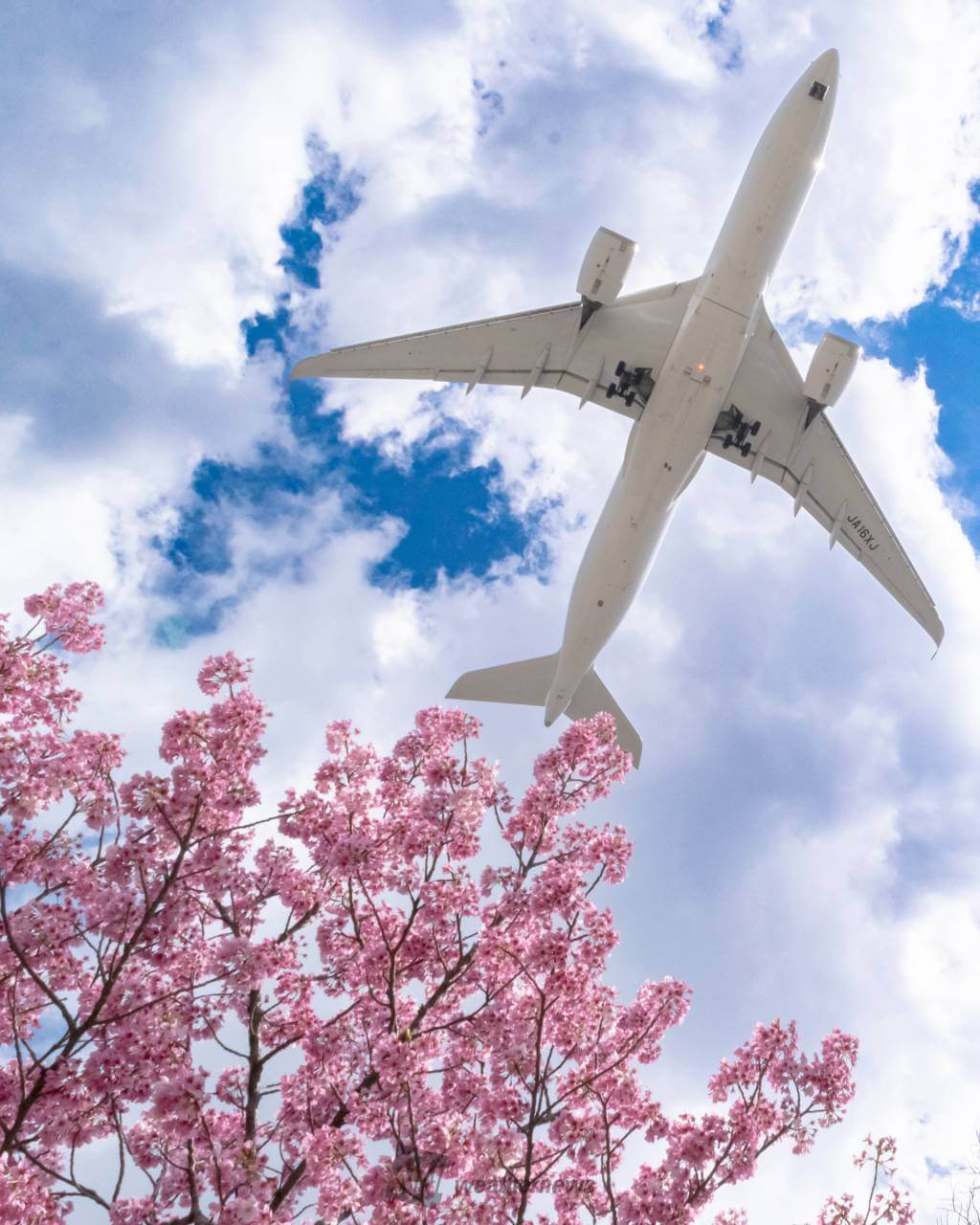 成田国際空港そばの成田山公園は、飛行機を撮る定番スポット。春は350本あるいは500本ともいわれる桜樹と飛行機を組み合わせられるので人気があります。そのため、たくさんの写真が発表されていますが、その中で、この作品が気を吐いて自己主張しているのは、地面スレスレのローアングルから見上げた視点が功を奏しています。淡青色の空を背景に、左右の桜並木群がスケール感豊かに表現されており、その空間に旅客機が飛び上がっていく様子が上手く表現されています。また、見物に訪れた人々が、点景として写し込まれているのも、画面に楽しい雰囲気を与えるアクセントとなっています。右下の黒く四角い石造りのものは一見すると不用な部分ですが、なぜかあまり気になりません。不思議ですがこれも愛嬌ですね。