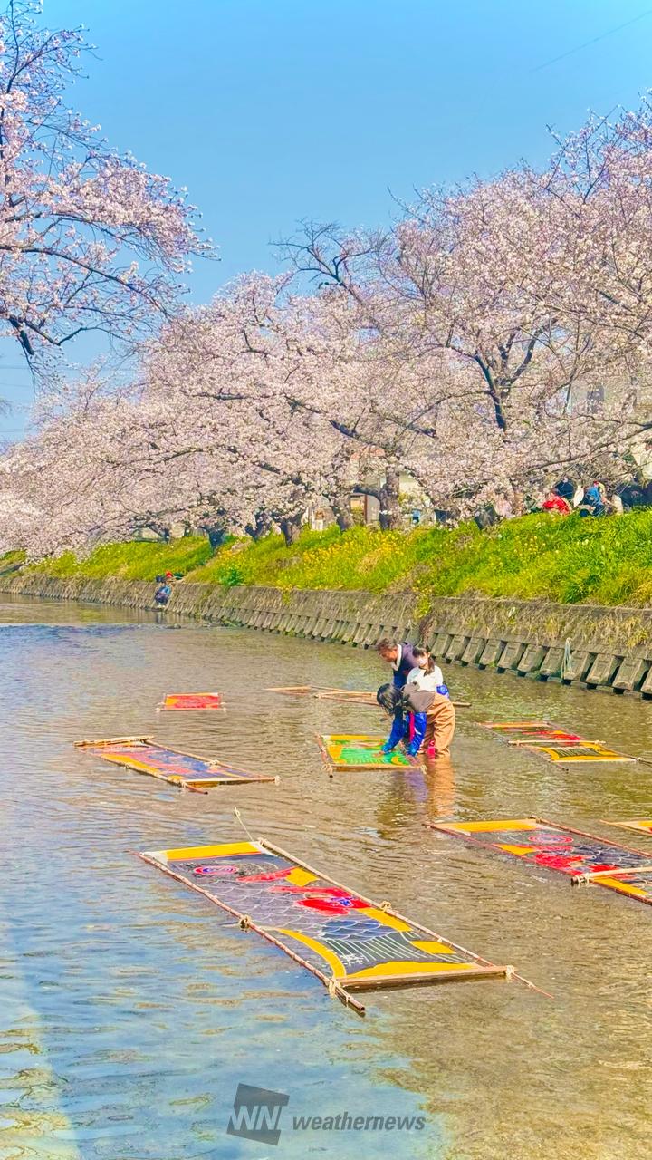 岩倉 五条川の〝のんぼり洗い〟🎏💦 桜満開の空に 洗い師と共に家族も参加の楽しい 伝統技法を見せて頂きました 🌸🌸🌸🌸🌸🧑‍🧑‍🧒  .*・゚🎏࿐⋆*🫧✨.*・゚🎏࿐⋆*🫧✨