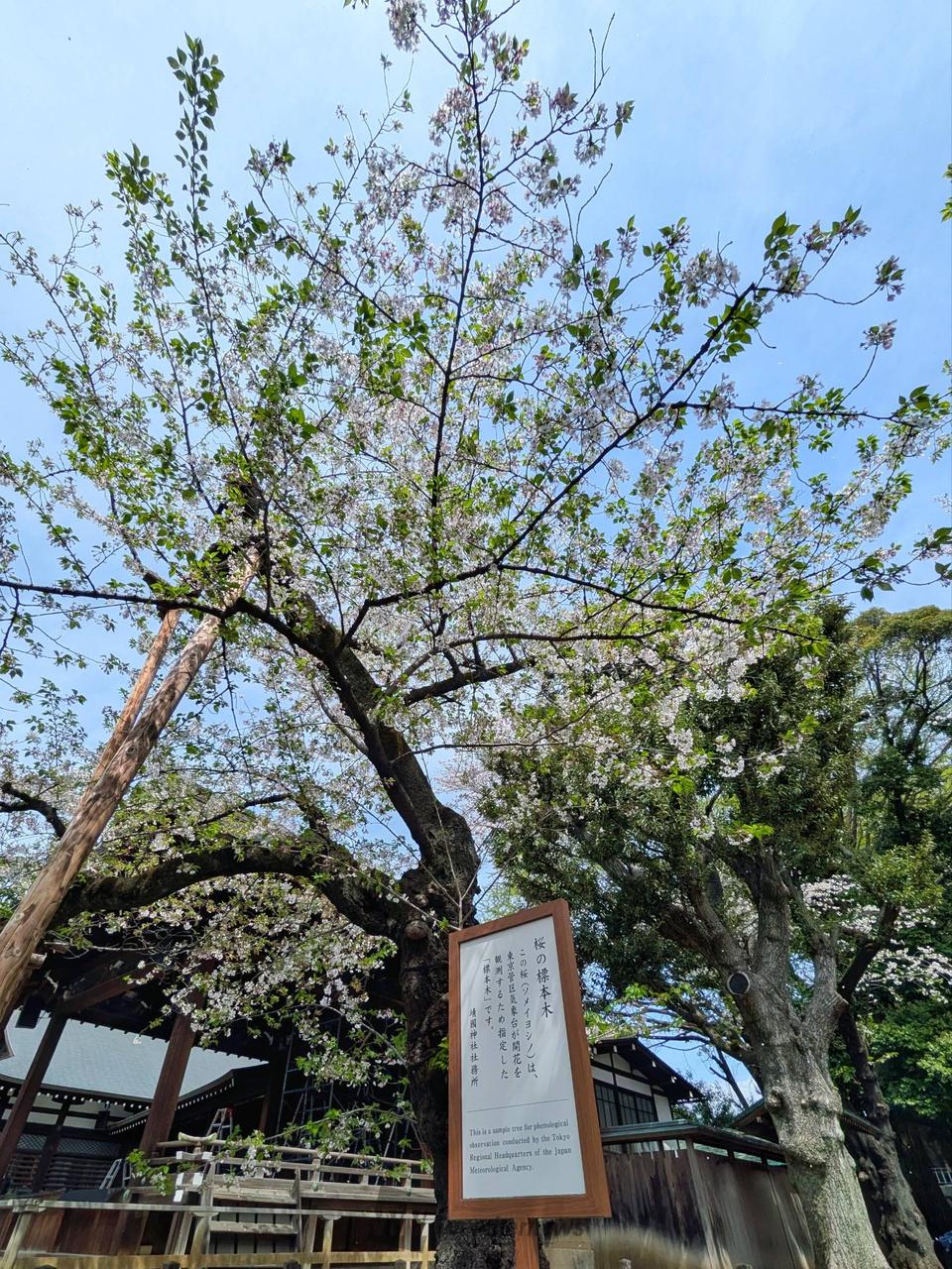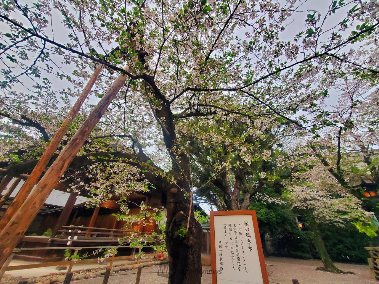 東京管区気象台が開花を観測するため指定した桜の標本木があり、桜の名所として知られています。桜の見ごろである3月下旬から4月上旬には「奉納芸能」「奉納夜桜能」などの催し物が行われ多くの参拝者でにぎわいます。また、「夜桜詣」では期間限定で神門の扉を開放し、内苑の夜桜をご覧いただけます。
