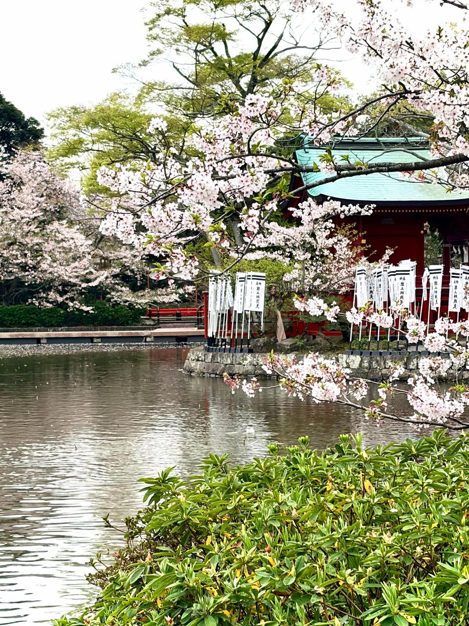 源氏池の周りを囲むように咲く桜が水面に映って美しく、段葛の桜も見どころ。