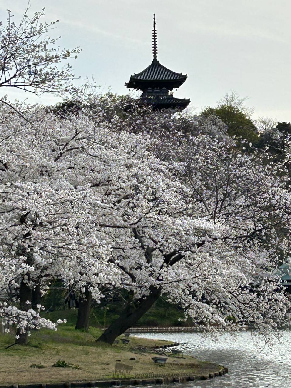 正門を入ってすぐの大池沿いの園路からは、対岸に咲き広がる淡いピンク色の桜が見渡せます。そこから丘の上にある重要文化財・旧燈明寺三重塔(関東地方にある木造の塔では最古)を大池越しに撮影するのがおすすめです。