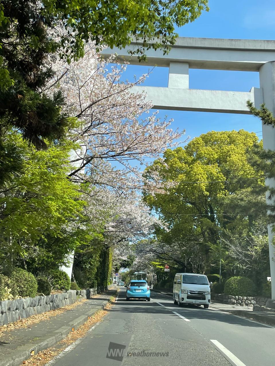 1kmにわたって約150本の桜の木が美しい花をつけます。ほかに参道の松並木(一之鳥居から本殿まで)、招霊の木(オガタマノキ)、敬宮愛子内親王誕生奉祝記念樹もあります。また、三笠宮彬子女王殿下により命名、植樹された「彬姫桜」もしっかりと根付き、美しい花を付けるようになりました。