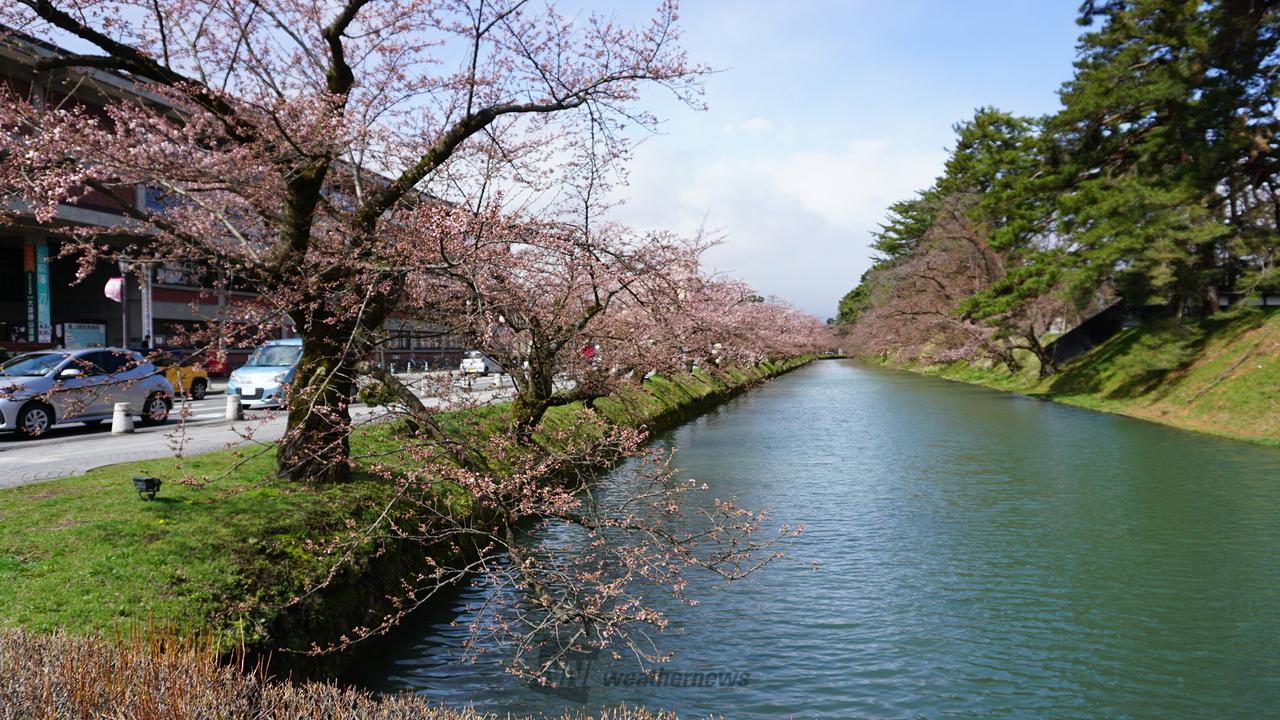 弘前城跡が公園になったもので、日本最古級のソメイヨシノ(青森県指定天然記念物・樹齢145年)や幹回りが日本一太いソメイヨシノ(環境省巨樹・巨木林データベース登録:582㎝)があります。また、弘前発祥の八重桜『弘前雪明かり』などソメイヨシノに続いて咲きはじめる桜が40品種約700本あり、その桜の中から厳選7品種の八重桜を『弘前七桜』と名付け、ソメイヨシノから始まる桜の見頃のリレーを楽しむことができます。