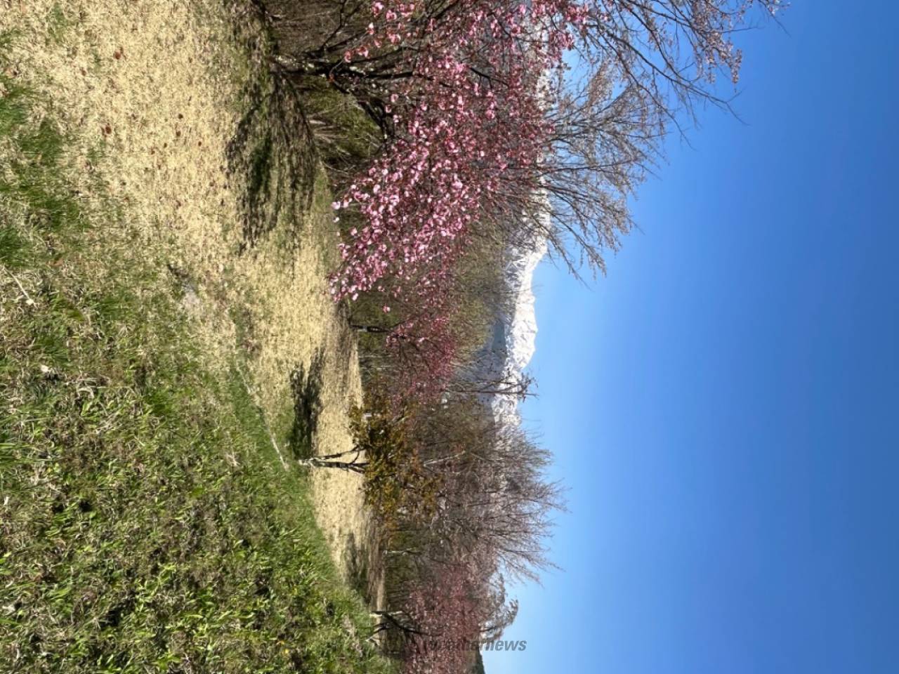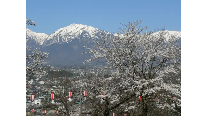 大町市街を見おろせる東山の中腹に位置しており、残雪の北アルプスを背景に見る桜はとても美しいです。他の名所と開花時期が異なることから穴場と言えます。ソメイヨシノ20本、オオヤマザクラ10本が美しい花を咲かせます。