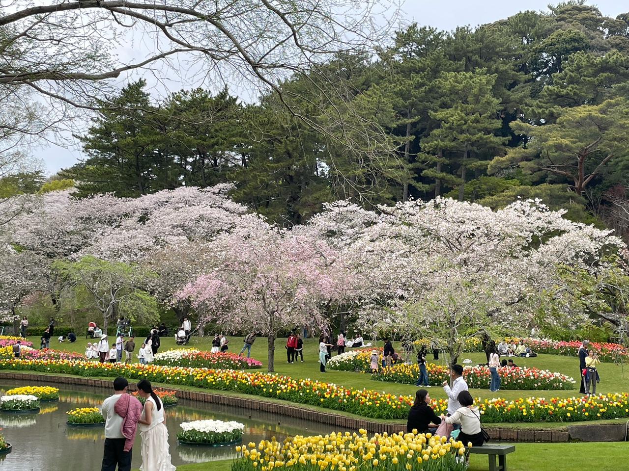 浜名湖ゲート付近の「水鳥の池」東側にある「ベニシダレザクラ」を、足元に咲くチューリップとともに撮影するのもおすすめです。