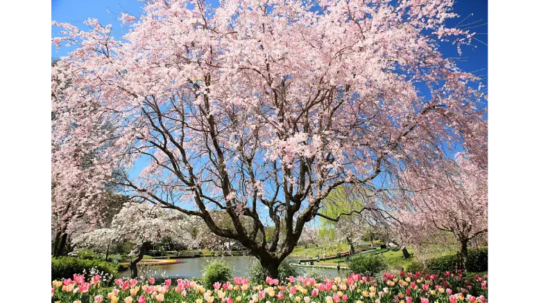 浜名湖ゲート付近の「水鳥の池」東側にある「ベニシダレザクラ」を、足元に咲くチューリップとともに撮影するのもおすすめです。