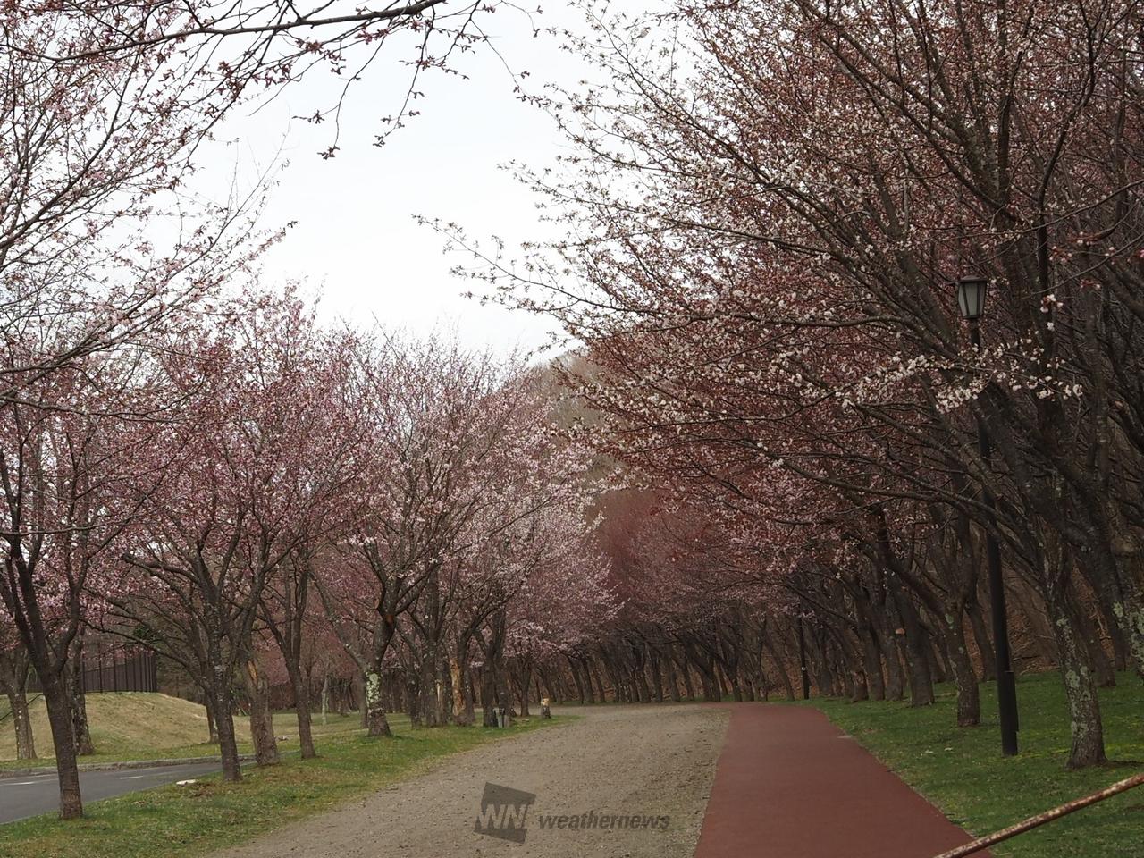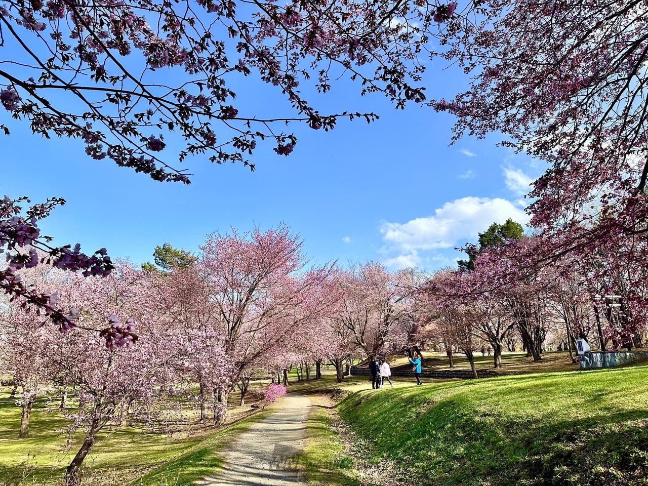園内に博物館や動物園、美術館、児童会館などの施設のほか、1200人が一度に座れる圧巻の400mのベンチを備える市内最大級の公園です。園内各所、とくに全長300mの「彫刻の径」を散策しての観桜は見ごたえがあります。このほか、グリーンパーク西側の「まっすぐの径」でも桜並木をお楽しみいただけます。