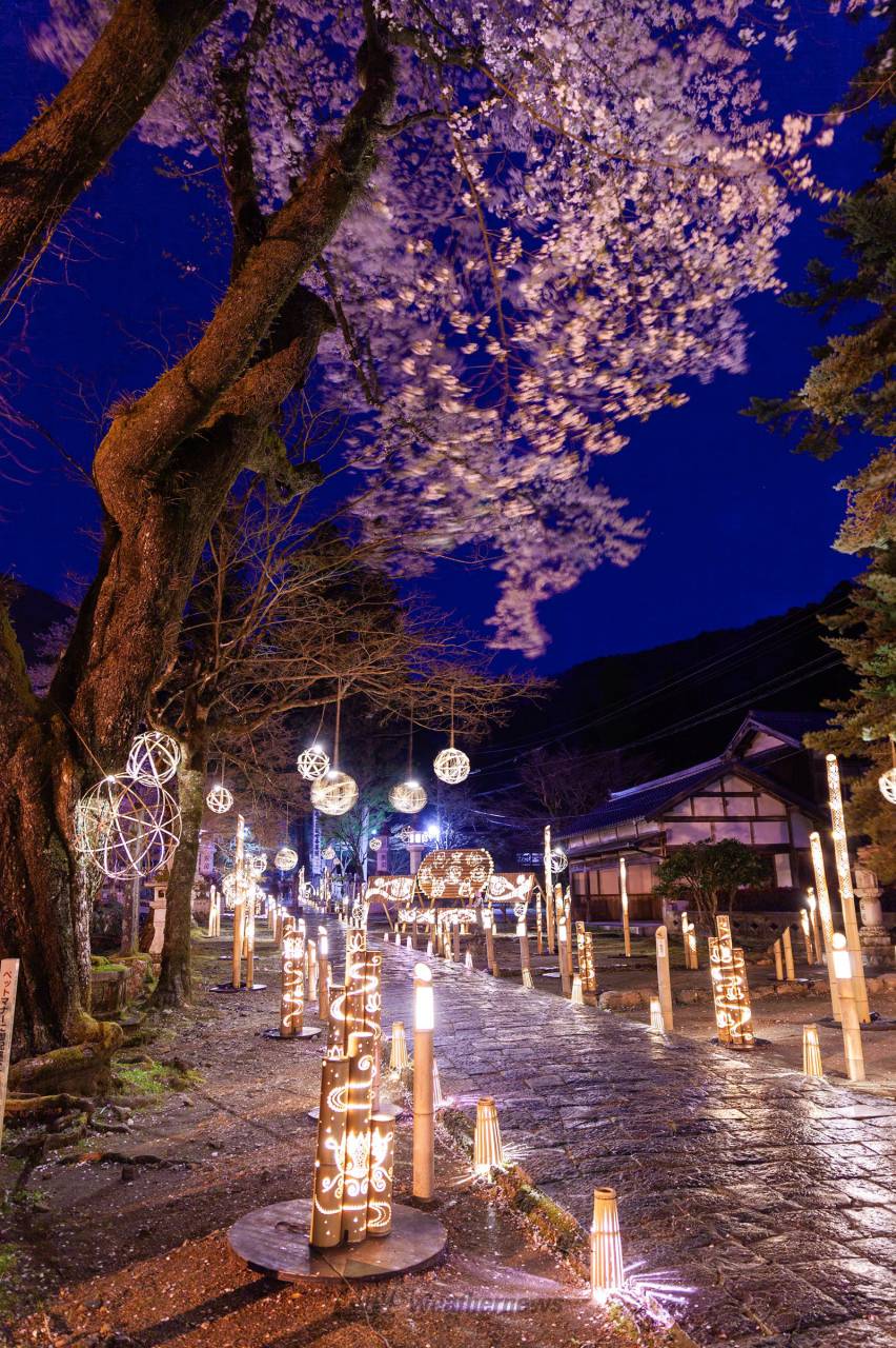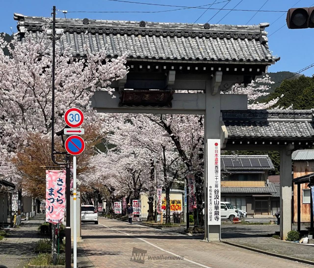 桜に包まれた参道が誘う西国33カ所霊場満願の地。旧名鉄谷汲駅から華厳寺まで桜の道が続きます。総門から仁王門までの参道には土産物店が軒を並べています。