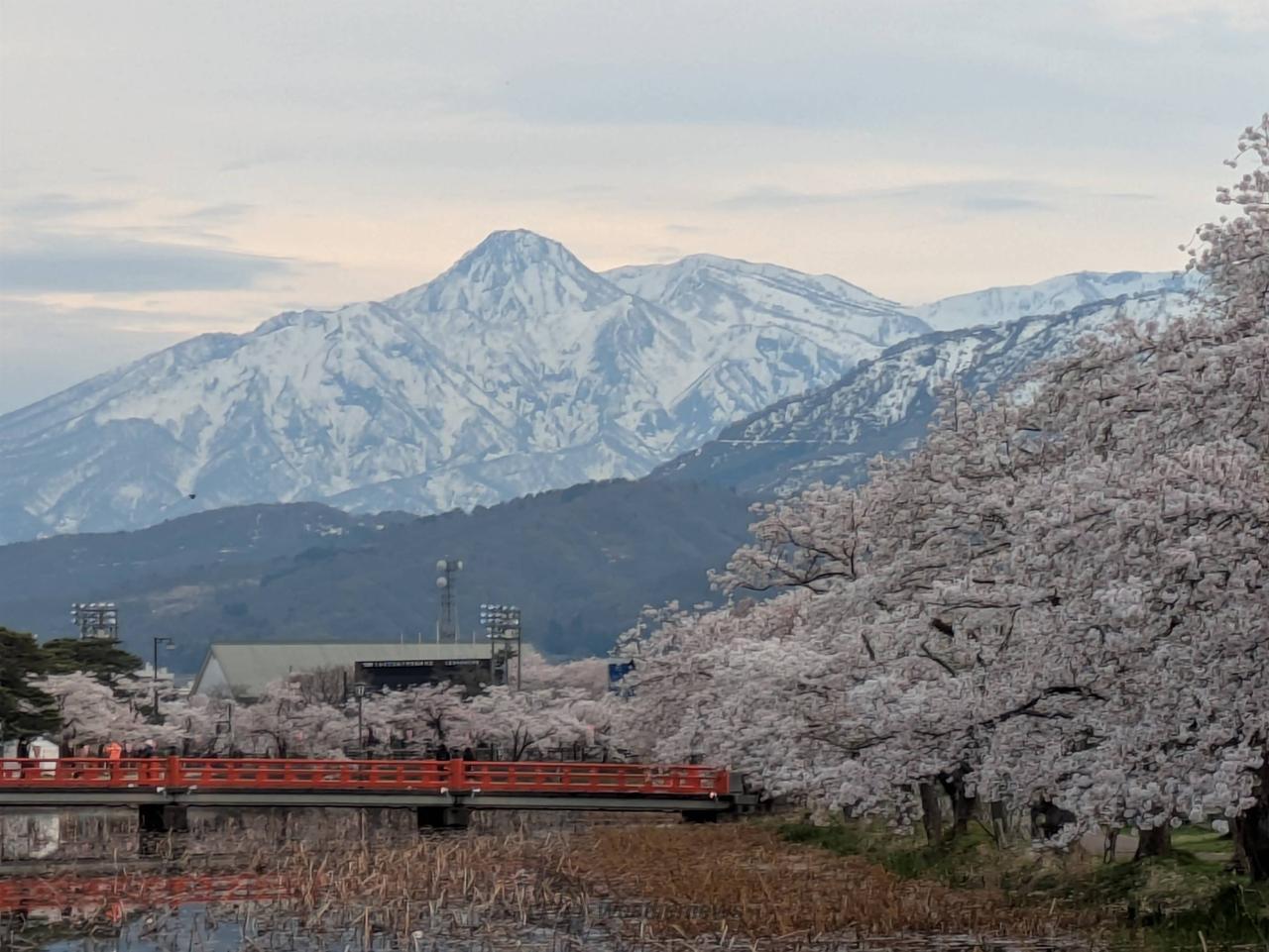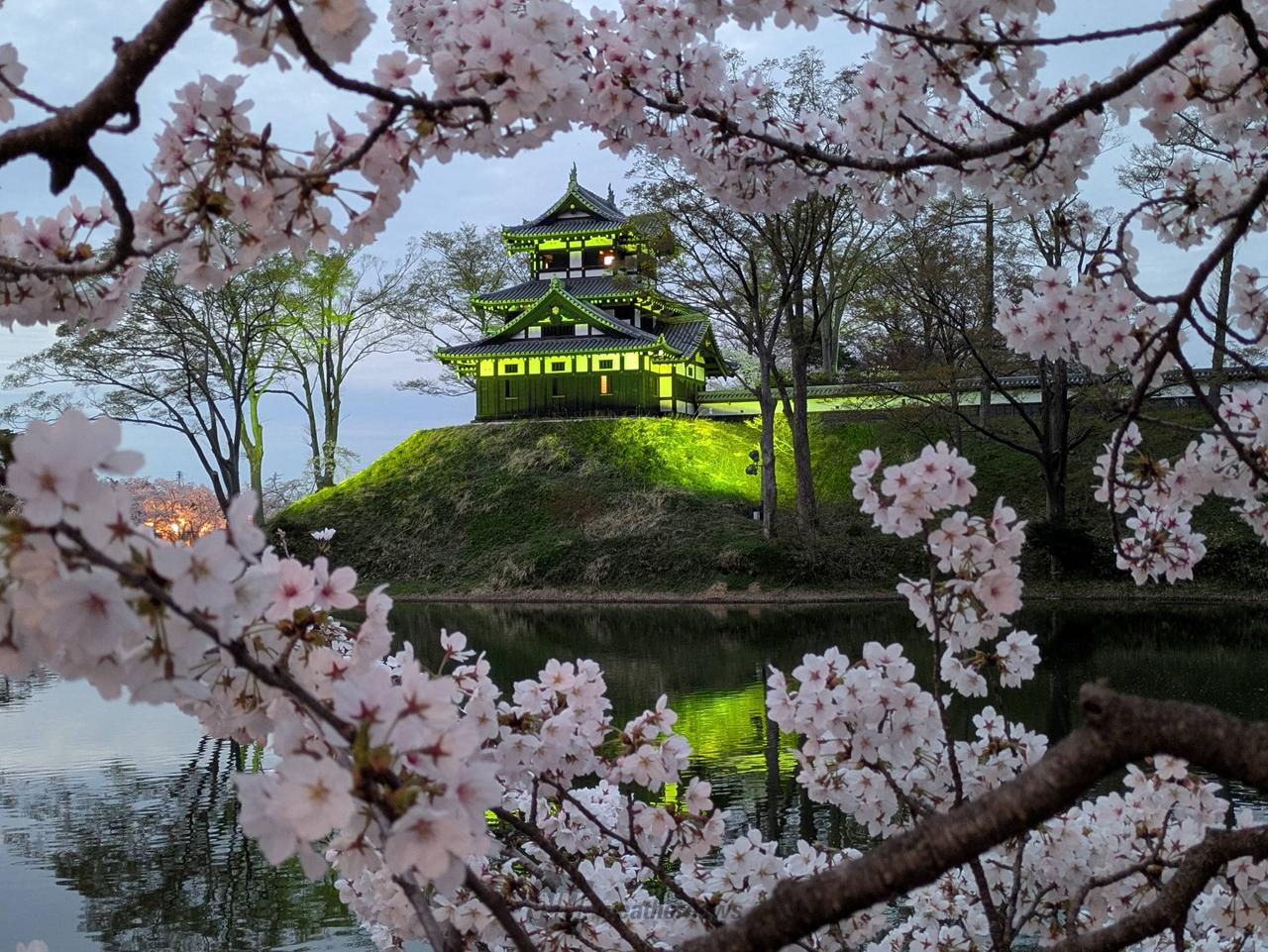 高田城址公園や、その周辺を含め約4000本の桜が咲き誇ります。また、ぼんぼりに照らされた美しい桜とライトアップされた高田城三重櫓が堀の水面に映える様が、日本三大夜桜の一つに数えらています。