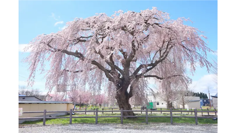 樹齢およそ300年と言われる道内最大級のしだれ桜。高さは約12mで枝振りが大変良く、垂れ下がった枝いっぱいに花がつくと大変見応えがあります。