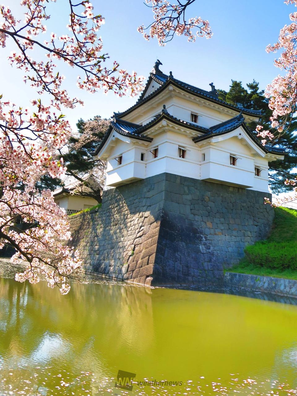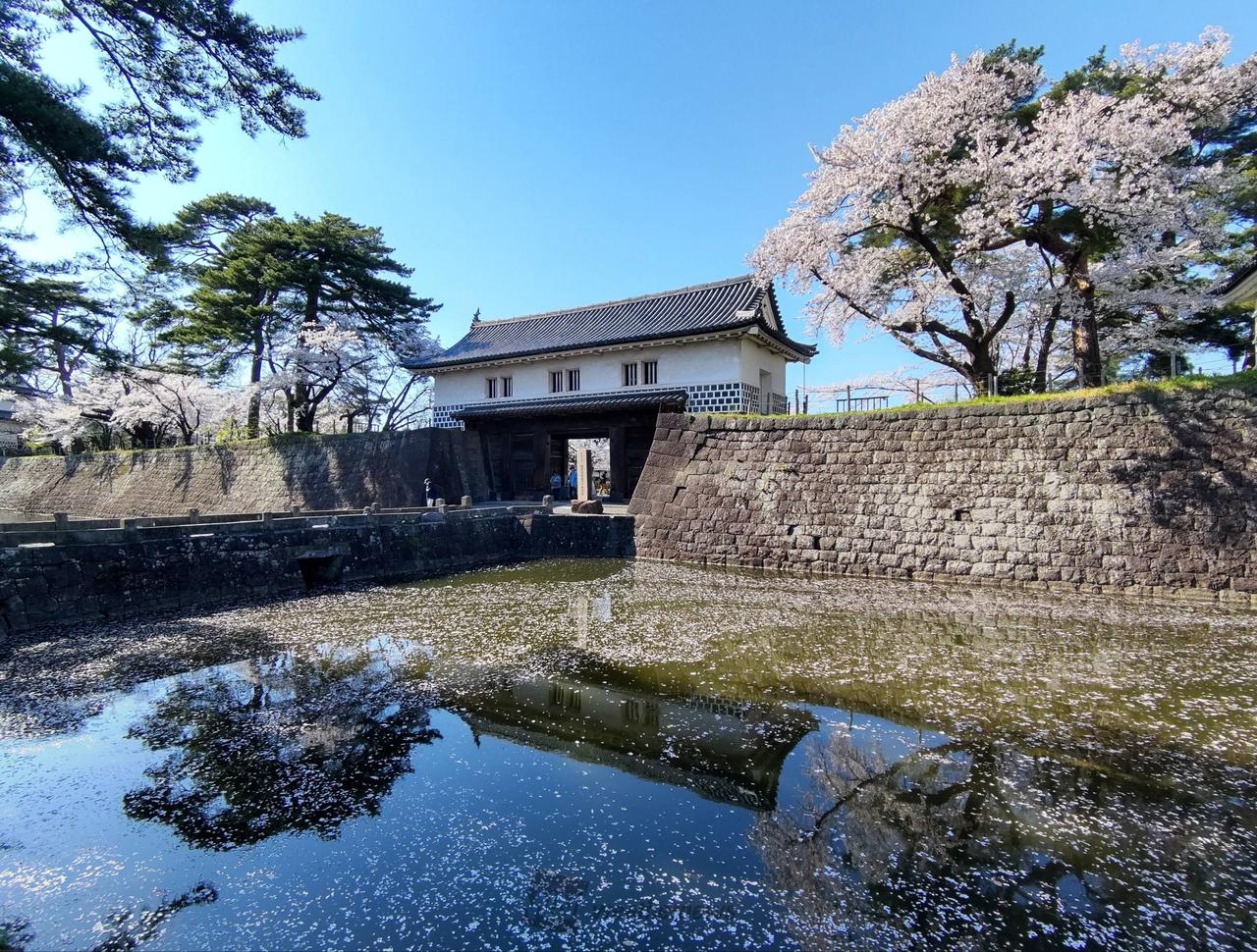 日本100名城「新発田城」すぐ横に位置する公園で、お堀沿いに整備された桜や園内各所に咲く桜が楽しめます。切込みはぎと呼ばれる美しい石垣や国の重要文化財に指定されている「表門」「旧二の丸隅櫓」と桜の共演は必見です。広大な公園内には芝生が敷かれており、ゆっくりとお花見するにはぴったり。開花時期に合わせて行われる新発田城のライトアップやぼんぼりの明かりが幻想的な雰囲気を演出します。