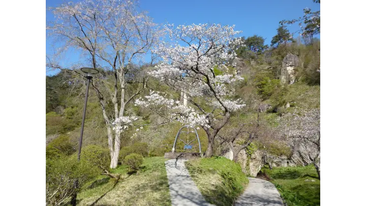 切り立った岩肌の奇岩がおりなす景勝地。眼下には七座山や、ゆったりと蛇行している米代川も望むことができます。また、開花に合わせてライトアップも行います。