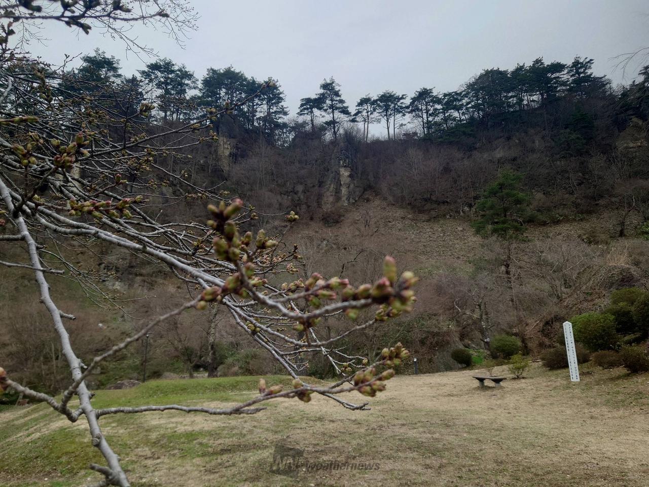 切り立った岩肌の奇岩がおりなす景勝地。眼下には七座山や、ゆったりと蛇行している米代川も望むことができます。また、開花に合わせてライトアップも行います。