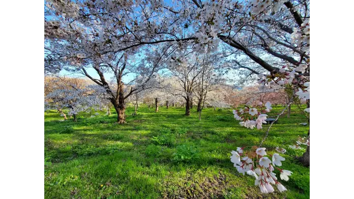 北海道天然記念物に指定された「鮪(しび)の岬」の上にある公園に、約300本の大小さまざまな桜が咲き誇ります。ソメイヨシノのほか、八重桜の南殿やエゾヤマザクラなどが時期をずらして咲き、4月下旬から5月上旬の期間、花見を楽しめます。桜に囲まれた小道を岬の先端に向けて抜けると、日本海の大海原が眼下に広がり、晴れた日には奥尻島を望むことも可能です。柱状節理と呼ばれ、マグロのうろこのように重なっている鮪の岬の独特な岩肌の鑑賞と、花見が一日で行えます。