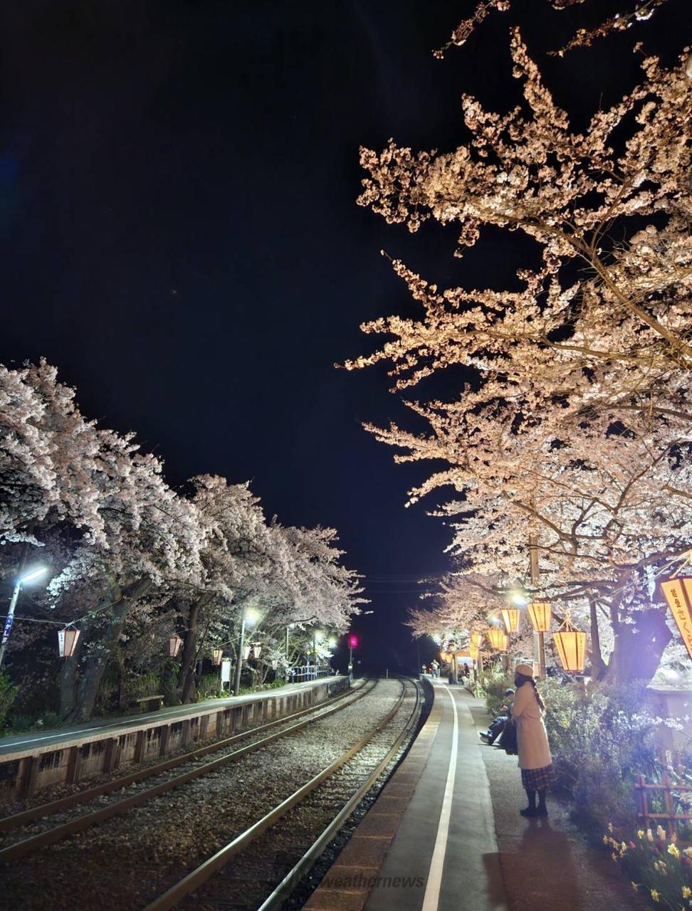 桜吹雪が舞う駅として名高く、約100本のソメイヨシノの木々がトンネルを造っています。