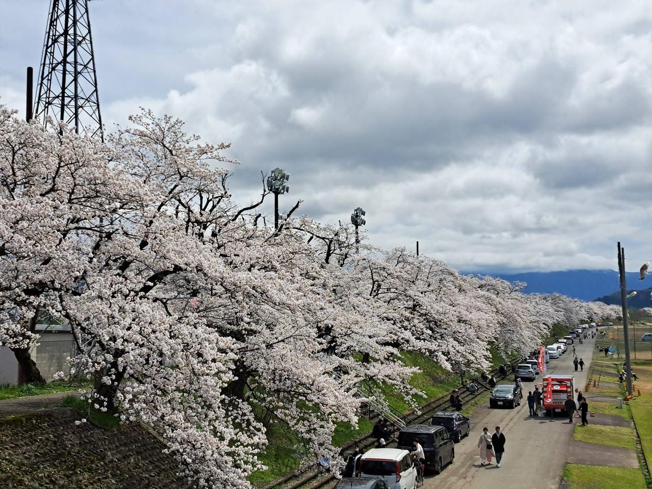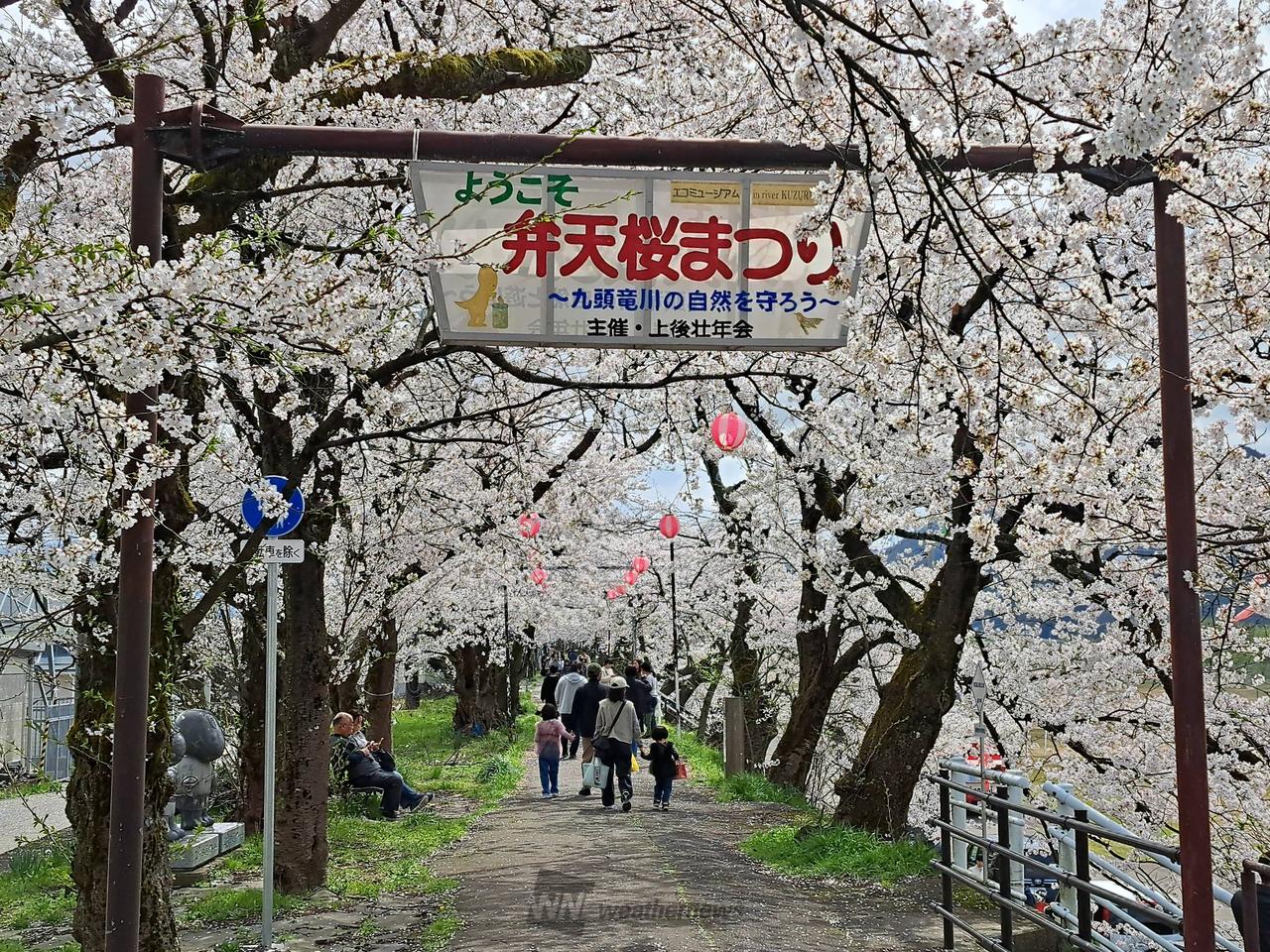 残雪輝く山々とのコンビネーションはまさに絶景!九頭竜川に架かる勝山橋をはさんで伸びる堤防(弁天堤防)に約450本の桜が植えられています。九頭竜川右岸、勝山橋の上流と下流にかけて1.5kmにおよぶ弁天桜は、県下に名の知れた桜の名所です。満開を迎える4月上旬から中旬頃には桜のトンネルが出現し多くの花見客で賑わいます。また、4月上旬より九頭竜川を横断して掲げられる鯉のぼりとの共演も見どころです。