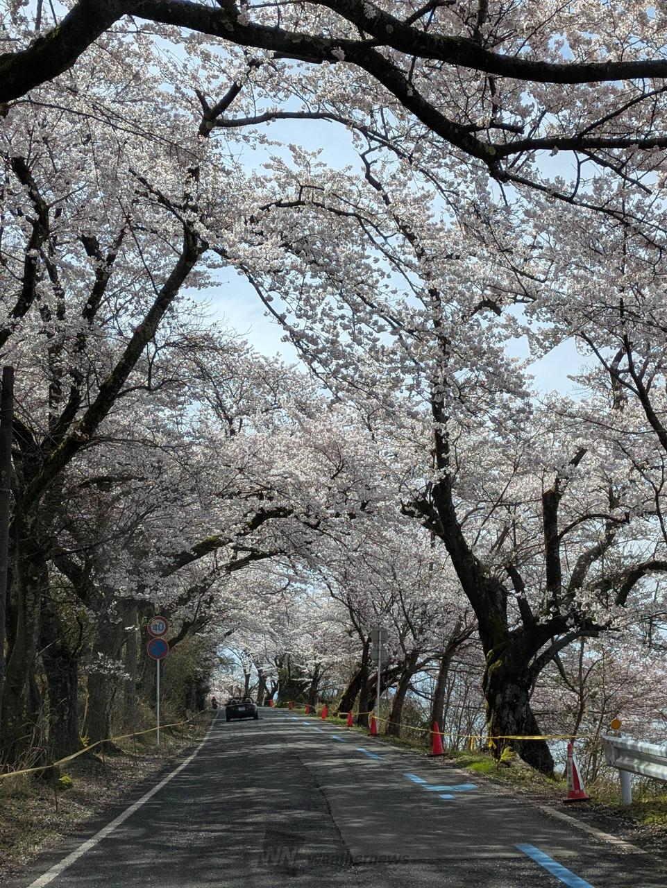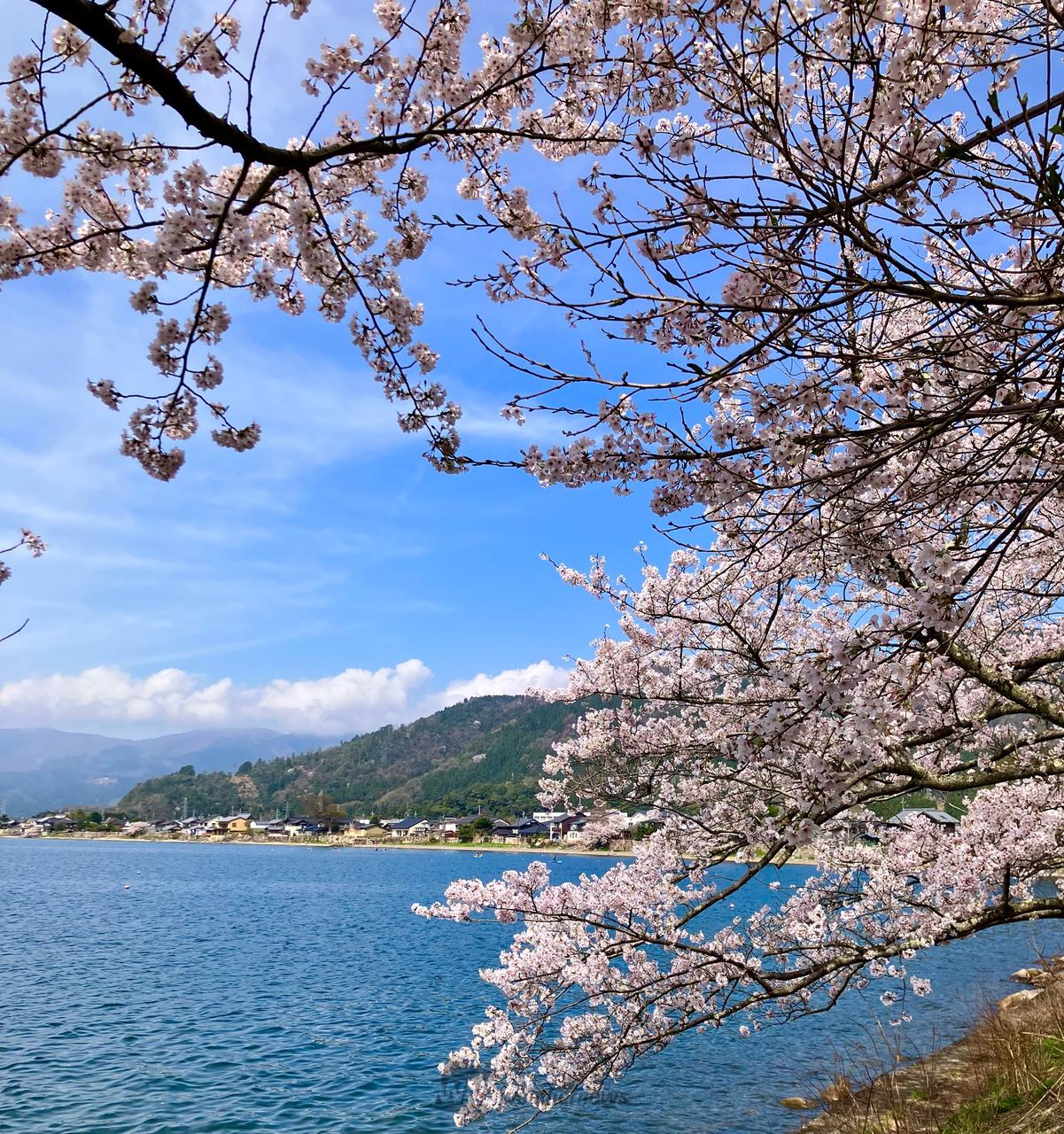 琵琶湖八景「暁霧・海津大崎の岩礁」として有名な景勝地で、湖岸に屹立する珍しい奇岩岩礁が神秘的で猛々しい雰囲気。湖岸沿い約4kmにわたって樹齢80年を超える老桜や次世代に引き継ぐ若木も含め約800本の桜並木が続き、近畿で最も遅い桜の名所として知られています。奥琵琶湖に春の訪れを告げる風物詩になっており「日本のさくら名所100選」にも選ばれています。