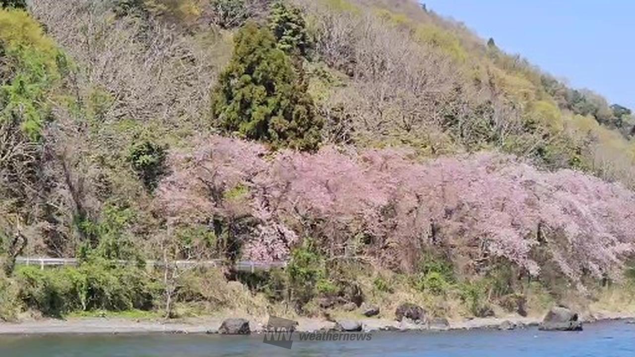 琵琶湖八景「暁霧・海津大崎の岩礁」として有名な景勝地で、湖岸に屹立する珍しい奇岩岩礁が神秘的で猛々しい雰囲気。湖岸沿い約4kmにわたって樹齢80年を超える老桜や次世代に引き継ぐ若木も含め約800本の桜並木が続き、近畿で最も遅い桜の名所として知られています。奥琵琶湖に春の訪れを告げる風物詩になっており「日本のさくら名所100選」にも選ばれています。