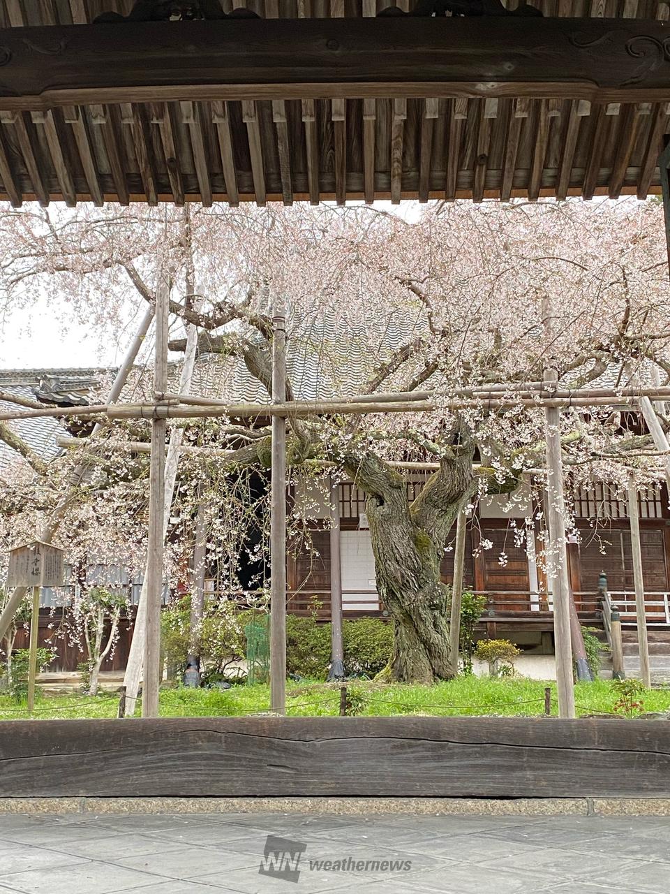 樹齢150年以上、枝幅30mのシダレザクラを中心に、境内を埋めつくすソメイヨシノ。紅シダレや牡丹桜、そして緑色の御衣黄桜も咲き誇ります。