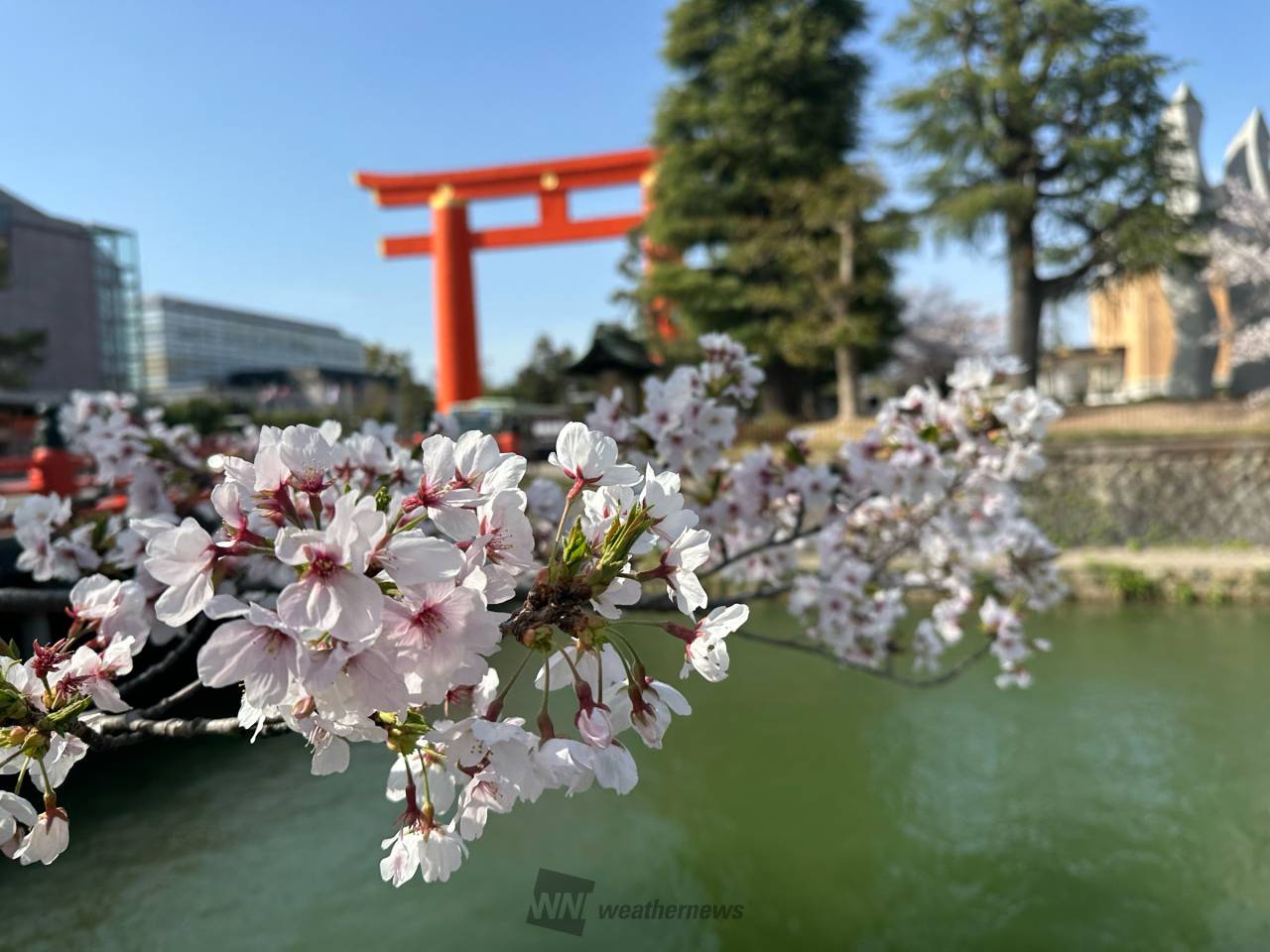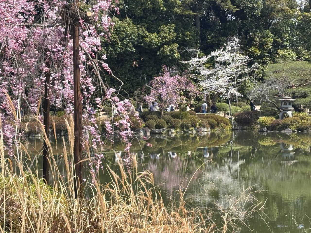 春の神苑で競い合うように咲き誇る約20種類300本の桜のうち、半数は紅しだれ桜です。八重咲きなので、見頃を迎えるのは3月下旬からですが、開花期間は長く、2週間も見頃が続きます。文豪、谷崎潤一郎も「細雪」の中で「夕空にひろがっている紅の雲」と情緒豊かに表現されています。