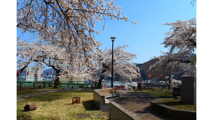 平和像がある広場では、釜石市街地を一望できます。桜だけではなく風景も楽しむことができます。