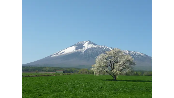 八幡平市の上坊牧野に咲く、知る人ぞ知る一本桜。霞がかかっているように見えることが由来の「カスミザクラ」は雄大な岩手山を背景に凛と立ち、その優しい色合いで来訪者を迎えます。