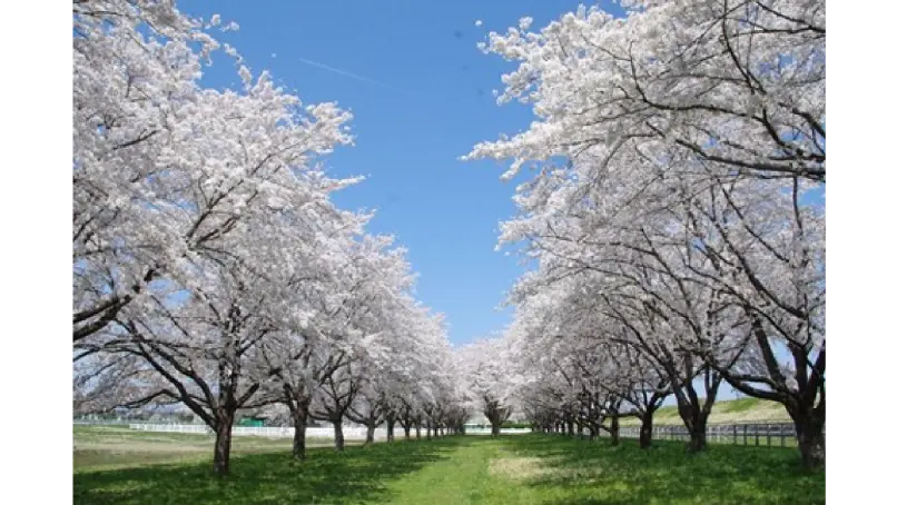 桜の時期のみ入ることができる北上川沿いの桜並木。競馬場のメインスタンドの向こう正面に位置し、電線や建物など空を遮るものが一切なく桜のトンネルと芝の絨毯の美しい景色が広がります。桜とともに競馬場を走る馬たちの姿を見ることもできます。