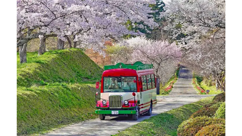 「夢見ヶ丘ガーデン」チューリップと桜の共演で百花繚乱が楽しめるフォトロケーションです。「桜坂」桜のトンネルが名所となっています。ボンネット型の周遊バスが通り抜ける撮影スポットが人気です。