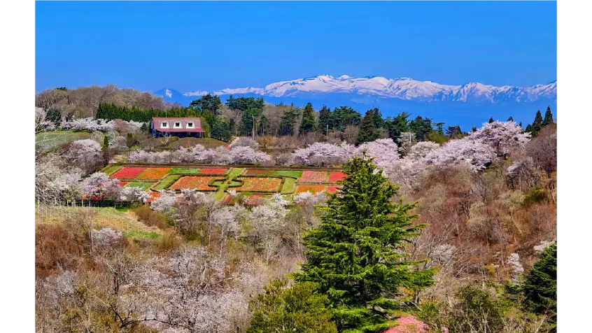 Ark館ヶ森は、100ヘクタールの広大な敷地に、季節の花々や様々な動物とのふれあいが楽しめる牧場です。春のハイライトは「チューリップと桜の共演」そして「桜のトンネル」です。「食といのちと自然」をテーマとした牧場で、桜を楽しみ牧場産の食事を楽しみ、春を満喫することができます。