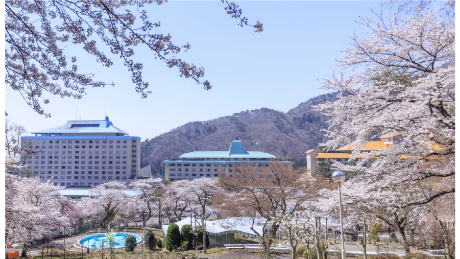 県内有数の桜の名所である花巻温泉。園内には約500本のソメイヨシノやしだれ桜が立ち並び、客室やバラ園から一望できる満開の桜並木は圧巻です。花巻市内より少し遅れて咲きはじめ、さらに花巻温泉の園内でも開花の時期が違い、長く楽しめるのが特徴です。