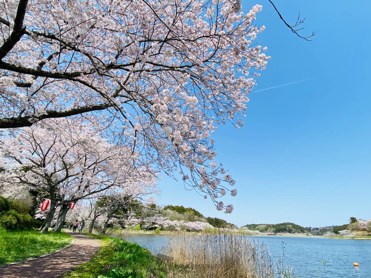 自然林に囲まれた平筒沼一帯は公園として整備され、春には遊歩道の沿道に800本の桜が花開く。低木の桜が並ぶ高台からは、市内の眺望を楽しみながら、ゆったりと桜並木を散策。名所の1つ沼に架かる浮き桟橋から見る景色は絶景。