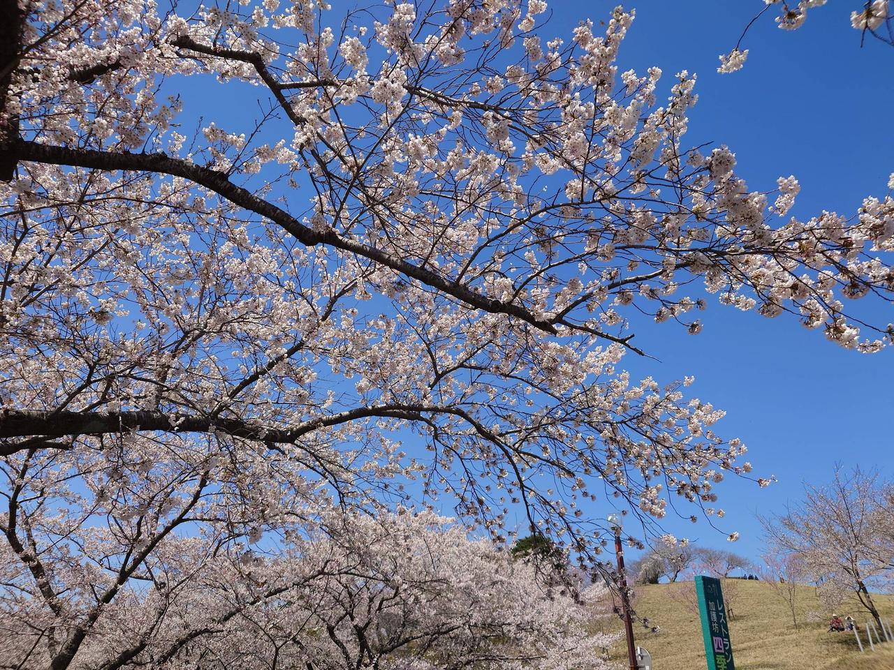 加護坊山の斜面に桜が咲くため、上から見下ろすように撮影すると、場所によっては桜のじゅうたんのような写真が撮れます。 また、桜の下では360°桜に囲まれたような写真が撮れるスポットもあります。 ソメイヨシノの見頃が過ぎる頃には八重桜が咲き始め、青空とのコラボレーションも楽しめます。 夜はピンク色にライトアップされ、幻想的な雰囲気に。ぜひ夜もお越しください。