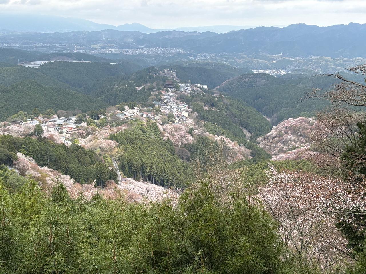 吉野山の谷から尾根を埋める桜はおよそ3万本です。標高の低い下千本(吉野駅付近)から中千本(如意輪寺付近)、上千本(吉野水分神社付近)、奥千本(西行庵付近)へと花期をずらして咲きのぼる様子は壮観です。
