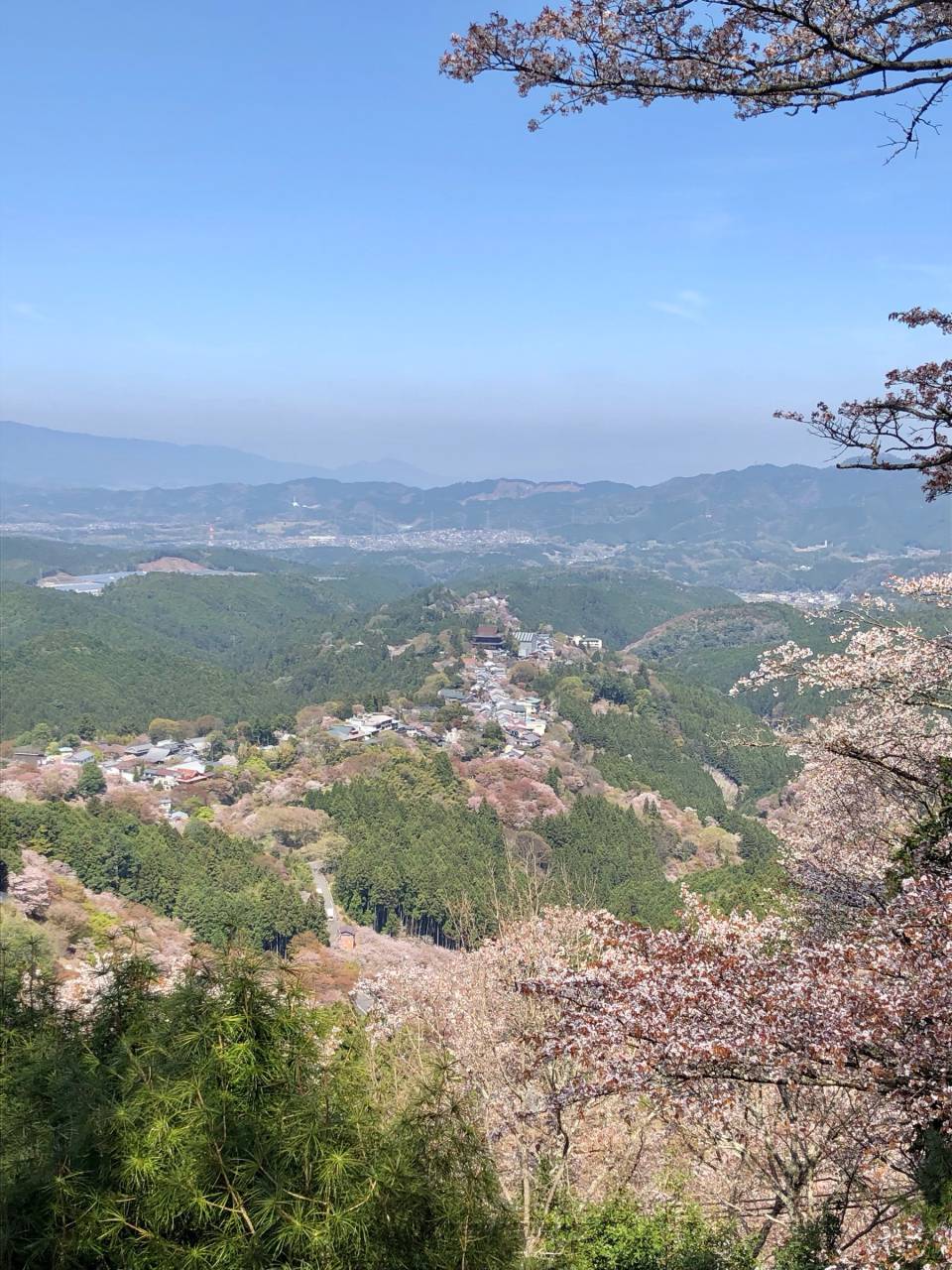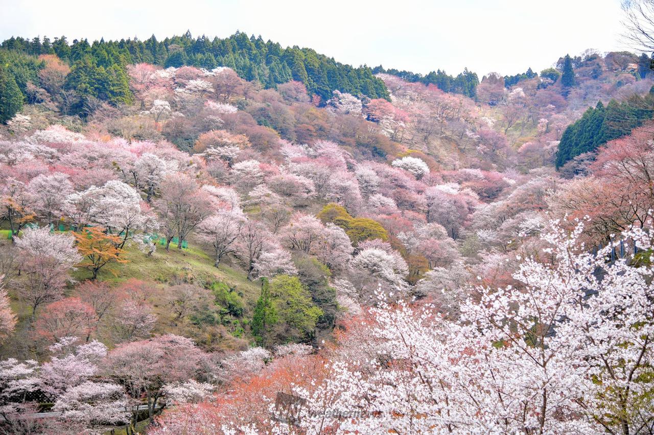 吉野山の谷から尾根を埋める桜はおよそ3万本です。標高の低い下千本(吉野駅付近)から中千本(如意輪寺付近)、上千本(吉野水分神社付近)、奥千本(西行庵付近)へと花期をずらして咲きのぼる様子は壮観です。