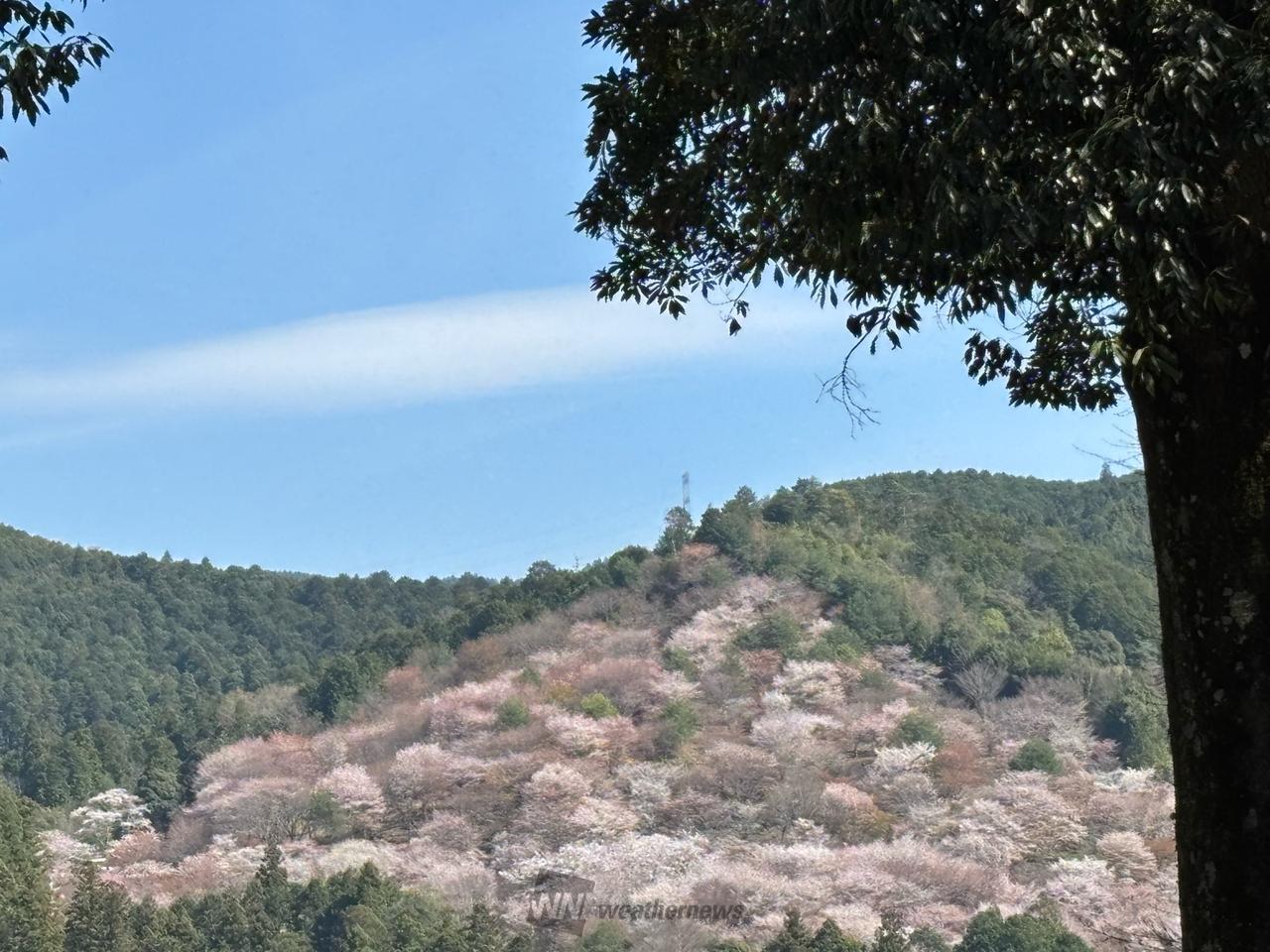 吉野山の谷から尾根を埋める桜はおよそ3万本です。標高の低い下千本(吉野駅付近)から中千本(如意輪寺付近)、上千本(吉野水分神社付近)、奥千本(西行庵付近)へと花期をずらして咲きのぼる様子は壮観です。