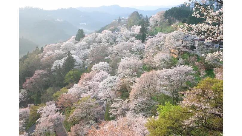 吉野山の谷から尾根を埋める桜はおよそ3万本です。標高の低い下千本(吉野駅付近)から中千本(如意輪寺付近)、上千本(吉野水分神社付近)、奥千本(西行庵付近)へと花期をずらして咲きのぼる様子は壮観です。