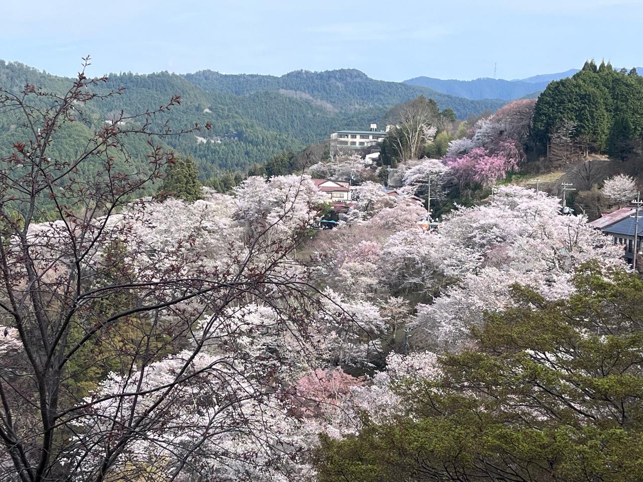 吉野山の谷から尾根を埋める桜はおよそ3万本です。標高の低い下千本(吉野駅付近)から中千本(如意輪寺付近)、上千本(吉野水分神社付近)、奥千本(西行庵付近)へと花期をずらして咲きのぼる様子は壮観です。