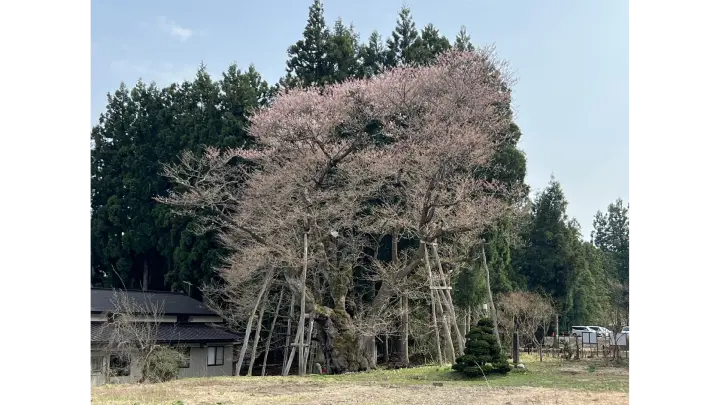 国指定天然記念物。樹齢はおよそ1200年、樹高14m、東西の枝張27mあり、個人宅に植えられた桜としては国内最大級の大きさを誇っています。伊達政宗が鮎貝の初陣で敗北を喫した際に、この桜に身を隠し生き延びたという伝説があり、「桜子の 散り来る方を 頼み草 岡にて又も 花を咲かせん」と詠み、後に家臣の横山勘解油(かげゆ)を遣わせ、手厚く保護にあたらせたという話も残っています。