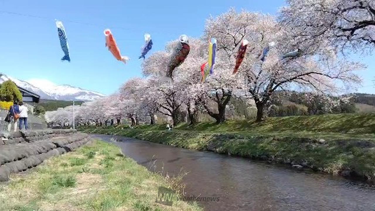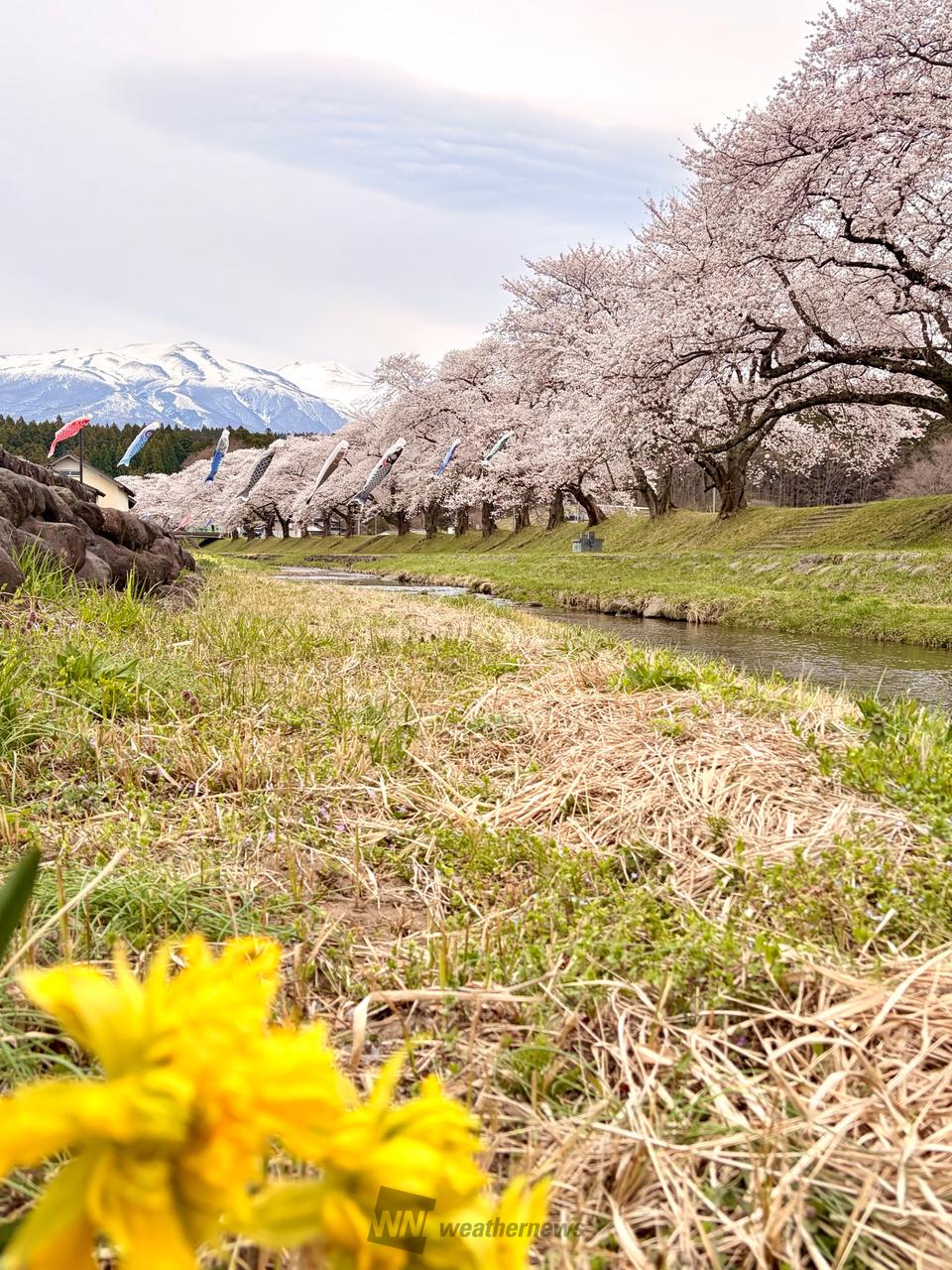 昔ながらの石垣の護岸が残り、庄内地方らしい黒瓦、黒板、白壁の建物の家並み。目を上げれば雪で真っ白に輝く鳥海山、そして満開の桜。初めて見るのにどこか懐かしい思いに捉えられる、日本の原風景的な桜並木が見どころ。