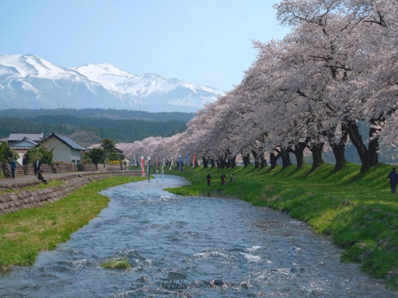 昔ながらの石垣の護岸が残り、庄内地方らしい黒瓦、黒板、白壁の建物の家並み。目を上げれば雪で真っ白に輝く鳥海山、そして満開の桜。初めて見るのにどこか懐かしい思いに捉えられる、日本の原風景的な桜並木が見どころ。