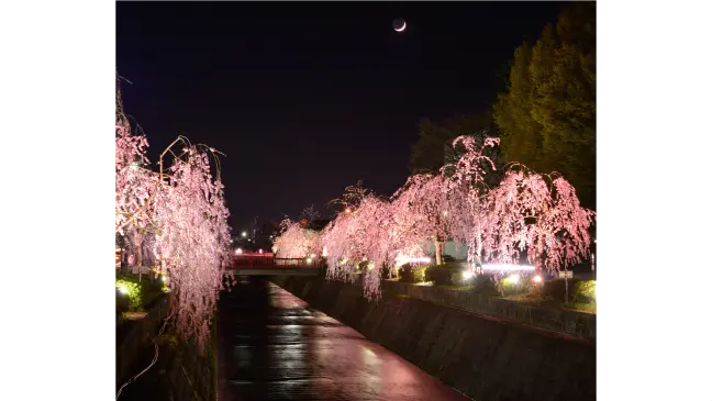 天童市中心部を流れる倉津川の両岸約1.4kmに枝垂桜が咲き誇ります。桜の開花時期には、約740mにわたってライトアップします。ライトに照らされた趣のある枝垂桜をご鑑賞下さい。