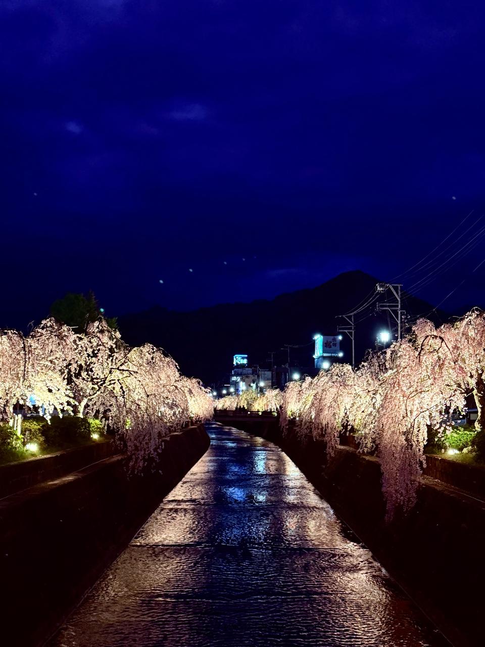 天童市中心部を流れる倉津川の両岸約1.4kmに枝垂桜が咲き誇ります。桜の開花時期には、約740mにわたってライトアップします。ライトに照らされた趣のある枝垂桜をご鑑賞下さい。