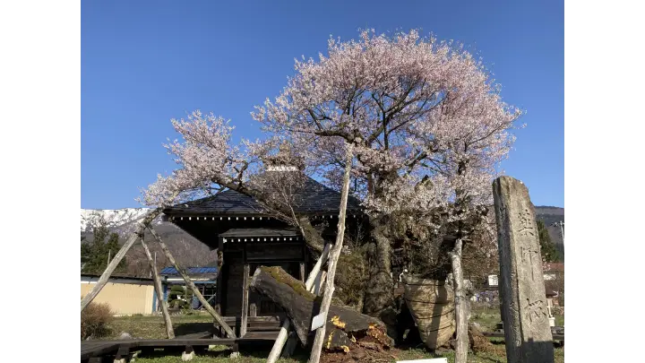 樹齢1200年のエドヒガンザクラ。高さ10m、太さ8m。薬師堂の境内にあり堂々たる風格を保っています。西暦796年坂上田村麻呂が奥州征伐の時、手植えしたものと伝えられています。県指定天然記念物です。