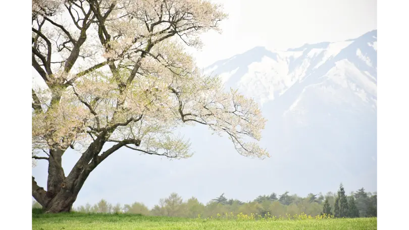 例年桜は4月中旬~4月下旬頃に見頃を迎えます。小岩井農場酪農発祥の地、上丸牛舎にはおよそ90本のソメイヨシノがあり、国の重要文化財に指定されている牛舎群と桜の見事な景観が楽しめます。また、残雪の残る岩手山を背景に緑の牧草地に根を張る小岩井農場の一本桜は写真スポットでも有名です。