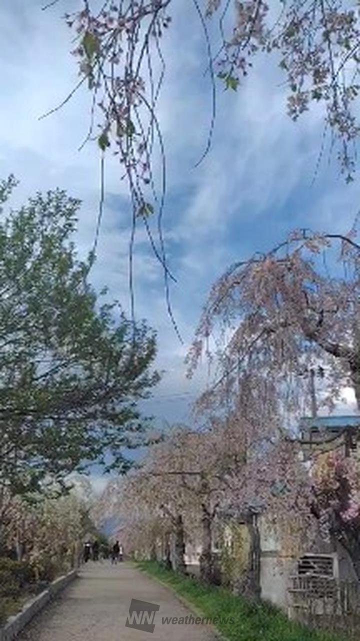 旧日中線の跡を「自転車歩行車道」として整備し、約3kmに渡り約1000本のしだれ桜が立ち並びます。通りには、桜のトンネルのようになっている壮観な場所や、かつて日中線を走っていたSLが展示されている人気のスポットもあります。