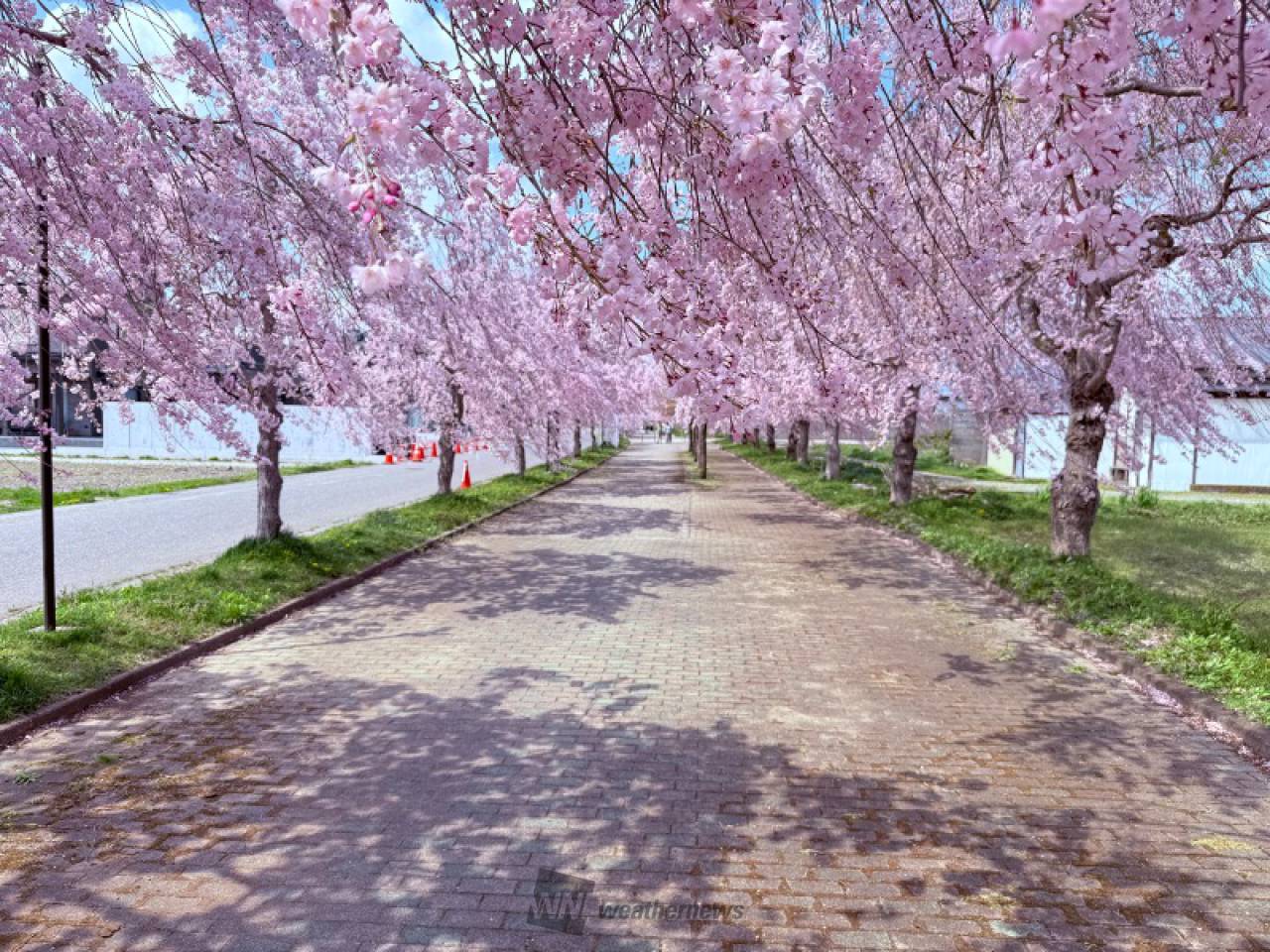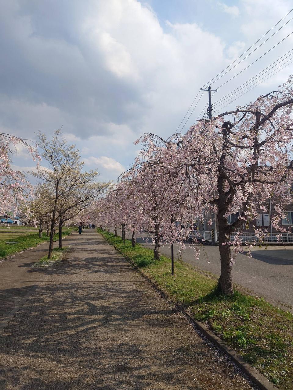 旧日中線の跡を「自転車歩行車道」として整備し、約3kmに渡り約1000本のしだれ桜が立ち並びます。通りには、桜のトンネルのようになっている壮観な場所や、かつて日中線を走っていたSLが展示されている人気のスポットもあります。