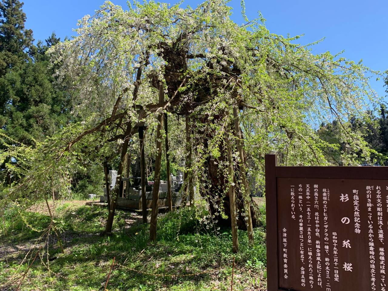 会津五桜の1つで、杉地区の薬王寺境内に咲く枝垂れ桜です。種類はエドヒガンザクラで、白い糸が垂れるように微紅色の花が咲きます。天正年間(1573年〜1592年)に植えられて、現在のものは二代目と言われ、町指定天然記念物になっており、両側の木はその子孫です。